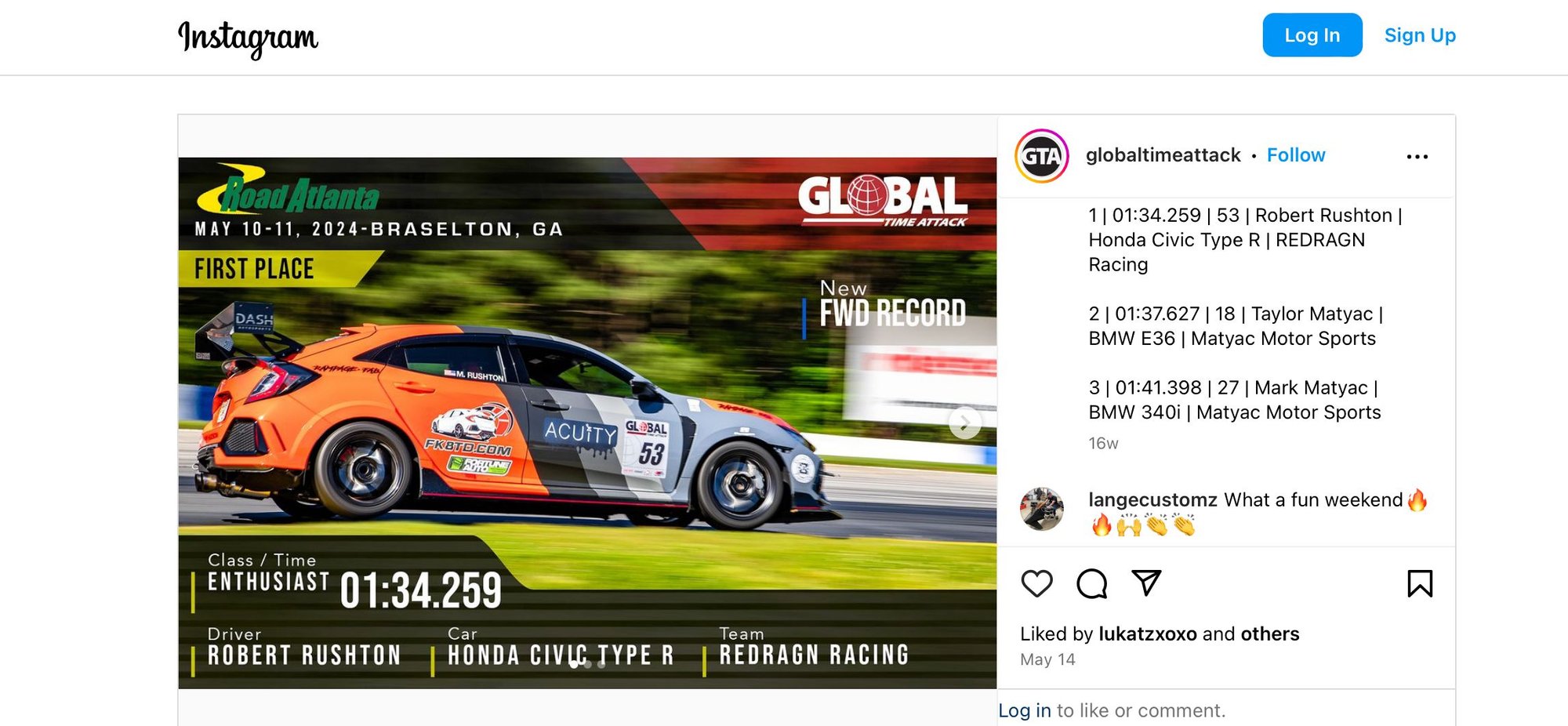 The FWD enthusiast record at Road Atlanta is 1:34 in a Type R with laundry list of mods. My first time there I ran a 1:39 with Stock interior, stock suspension with a boost leak losing 6psi with a laggy top end turbo made for the street(I’m losing corner exit speed). Then I popped a fuel line so I was done for the weekend. Here’s the car below that ran a 1:34. Looks like I would’ve placed 3rd that day.