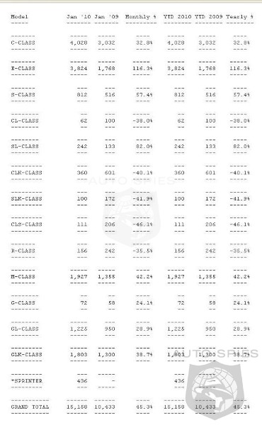As further proof of the Mercedes-Benz competitive presence in the luxury light truck market, the champion M-Class reported sales of 1,927, up 42.2% over last January; the sporty GLK followed suit with sales of 1,803, up 38.7% - beating its launch numbers of 1,300 posted in January 2009.
