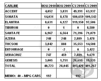Hyundai Motor America today announced an all-time record for November sales of 40,723 units, up 45 percent versus 2009.