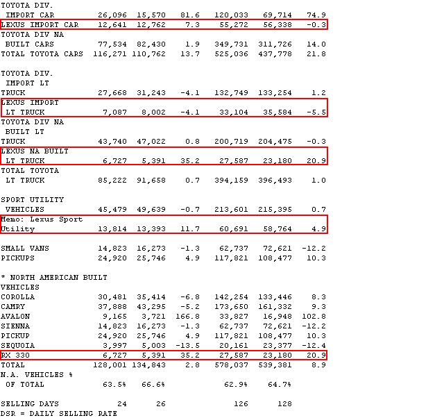Lexus Division light trucks produced best-ever May sales with 13,814 units, up 11.7 percent. The 2006 RX 400h, launched in April as the world's first luxury hybrid vehicle, reported sales of 2,931 units for the month. The RX 330 luxury SUV on which the RX 400h is based, enjoyed combined May sales of 10,707 units, an increase of 20.1 percent.