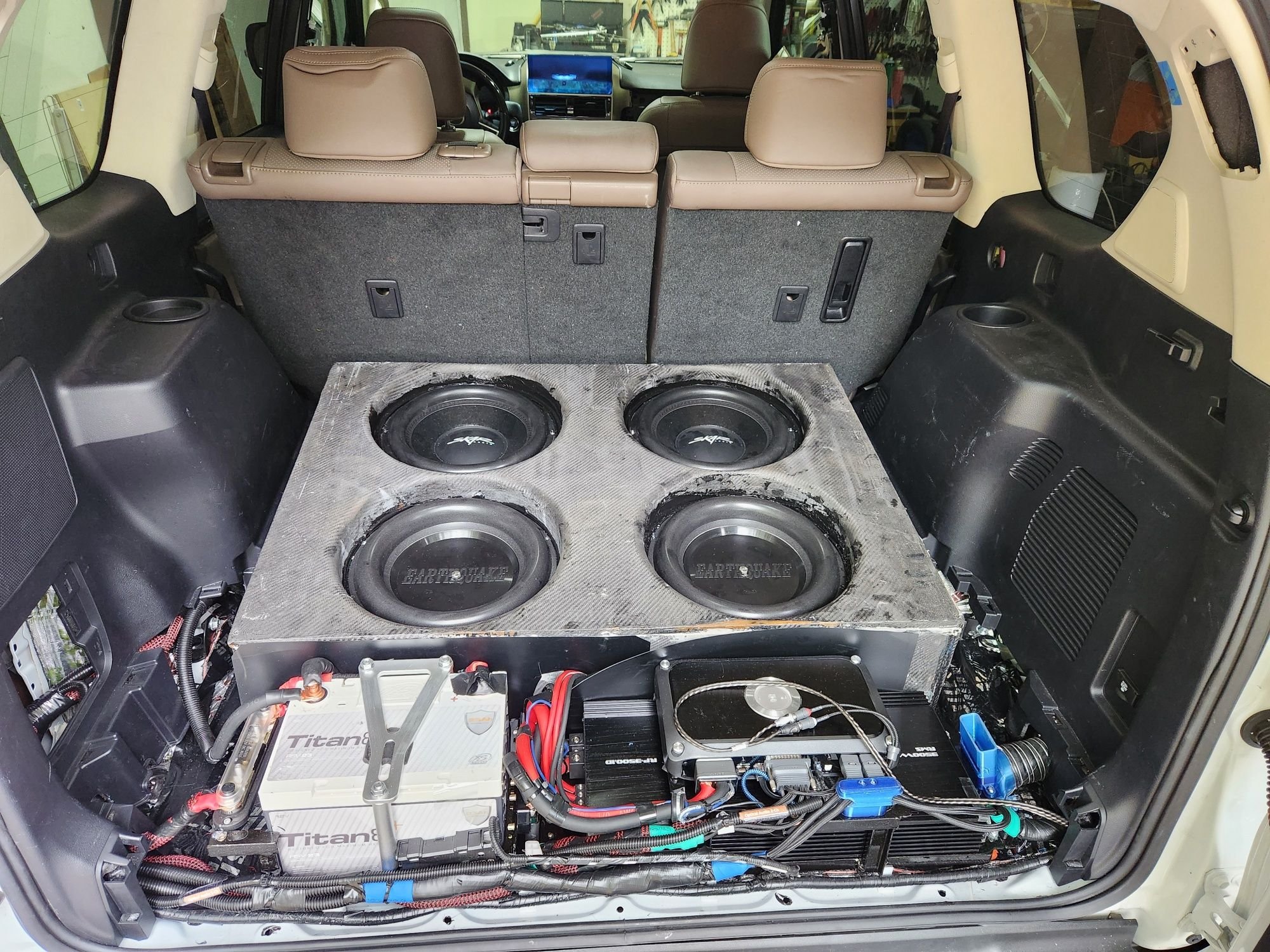 Sub enclosure mounted, showing 2 subs, and 2 Passive Radiators (later removed, as the subs sound better without them). The rear LTO battery is also mounted in its frame. To the right, the AC cooling duct and the blue 3D printed AC multi-outlet cooling manifold can be seen (top missing). The rear AC cools the amplifiers:
