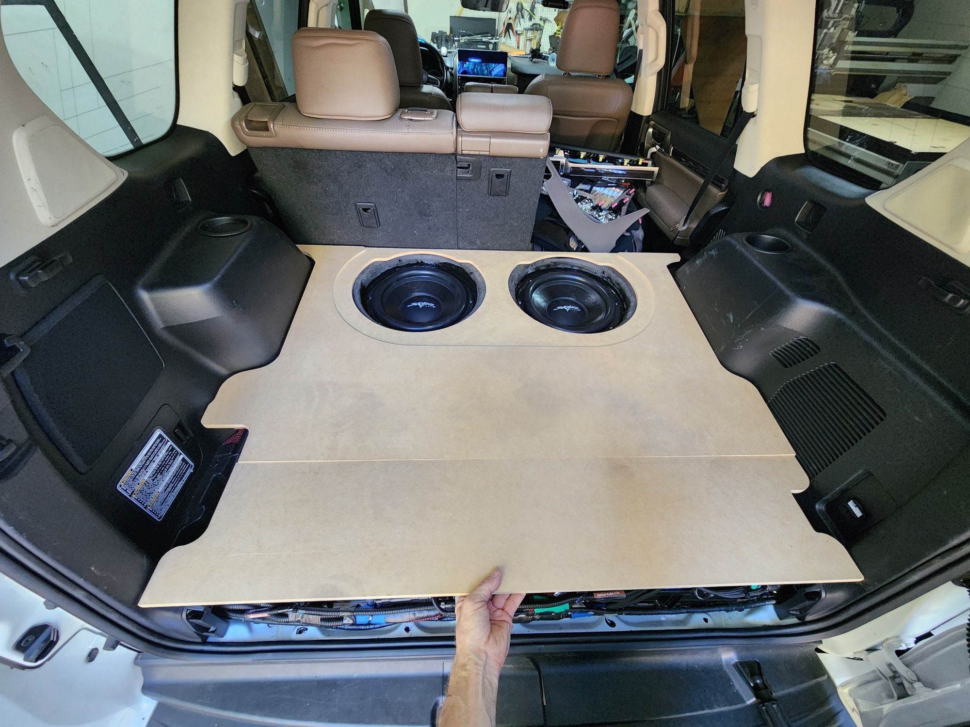 This is how it looks both during and after install. I put the LC2i and Amp behind the 2nd row and underneath the 3rd row when folded down. Our kids are older so we never use the 3rd row at all. I had this same setup in my previous GX and put the amp and LOC underneath the driver seat, and while it was mostly out of sight, it stuck out a bit too much in the 2nd row footwell and people would oftentimes accidentally kick or bump it with their feet. The JL bass control **** is mounted on the dash trim piece just to the left of the steering wheel. Clean and easy to install there.
