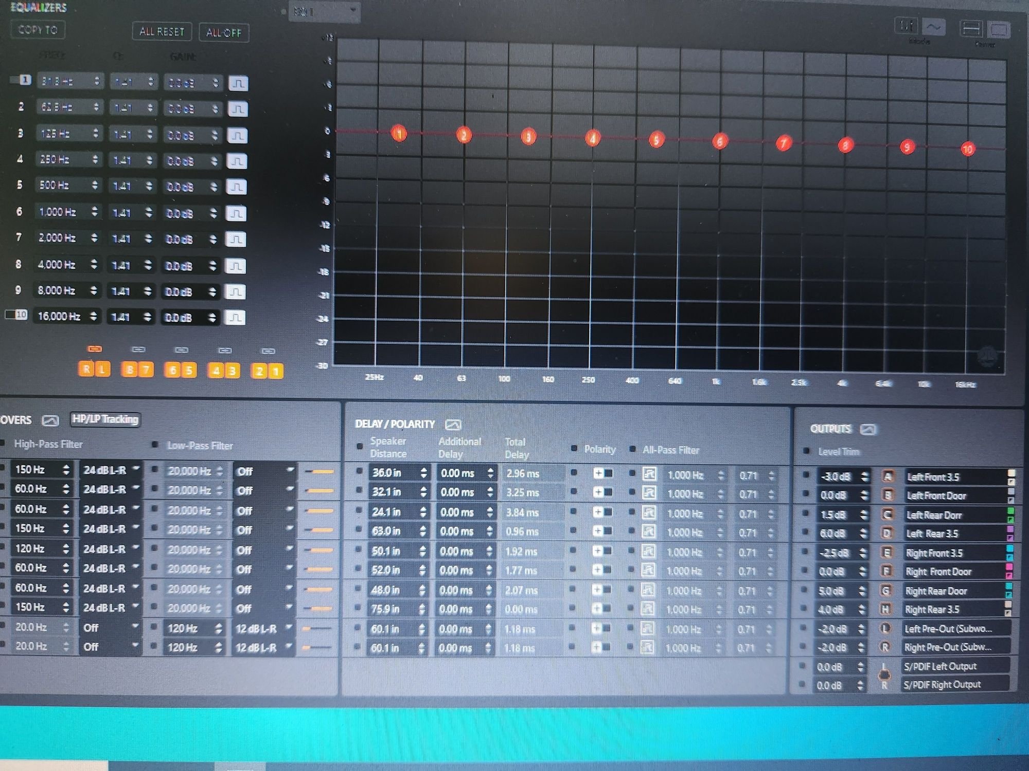 Here's a photo of the JL Audio TuN DSP. You can see that I have measured the distance from each speaker, to my ears, and entered it in the fields. The DSP then calculates the delay. It sets the furthest speaker to zero, and adds a delay to each subsequent speaker. The closest speaker to my ear (the front door tweater) has the longest dealy. Therefore the sound from all speakers hits my ear at the same time. The before and after is amazing.