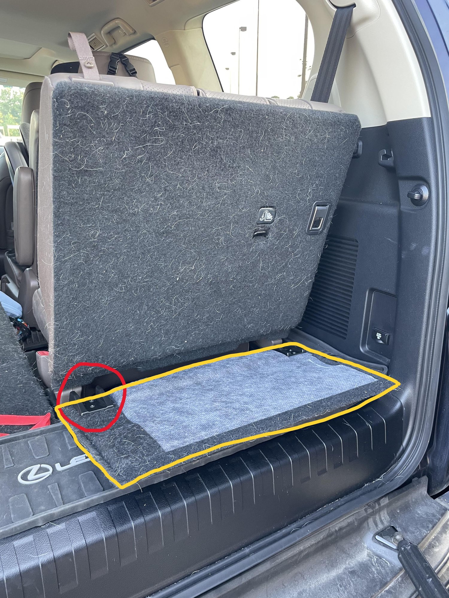 So I can't find this anywhere after looking through the parts diagrams and even contacting Bell Lexus. Thought someone might be able to help. There's a lower trim piece on the back of the 3rd row seats that folds down to cover the seat when they are laid down and maintains tension on the back of the seat with a spring mechanism when they are up. Basically forms part of the cargo floor when the seats are down. It has a little plastic hook that attaches to the spring to keep it taut on the seat. My wife took her vehicle to get detailed and they pulled on that thing and snapped the plastic hook. Trying to find a replacement and it isn't on the seat diagrams or the trim diagrams that I can find. Anyone dealt with this and know where I can find a replacement?