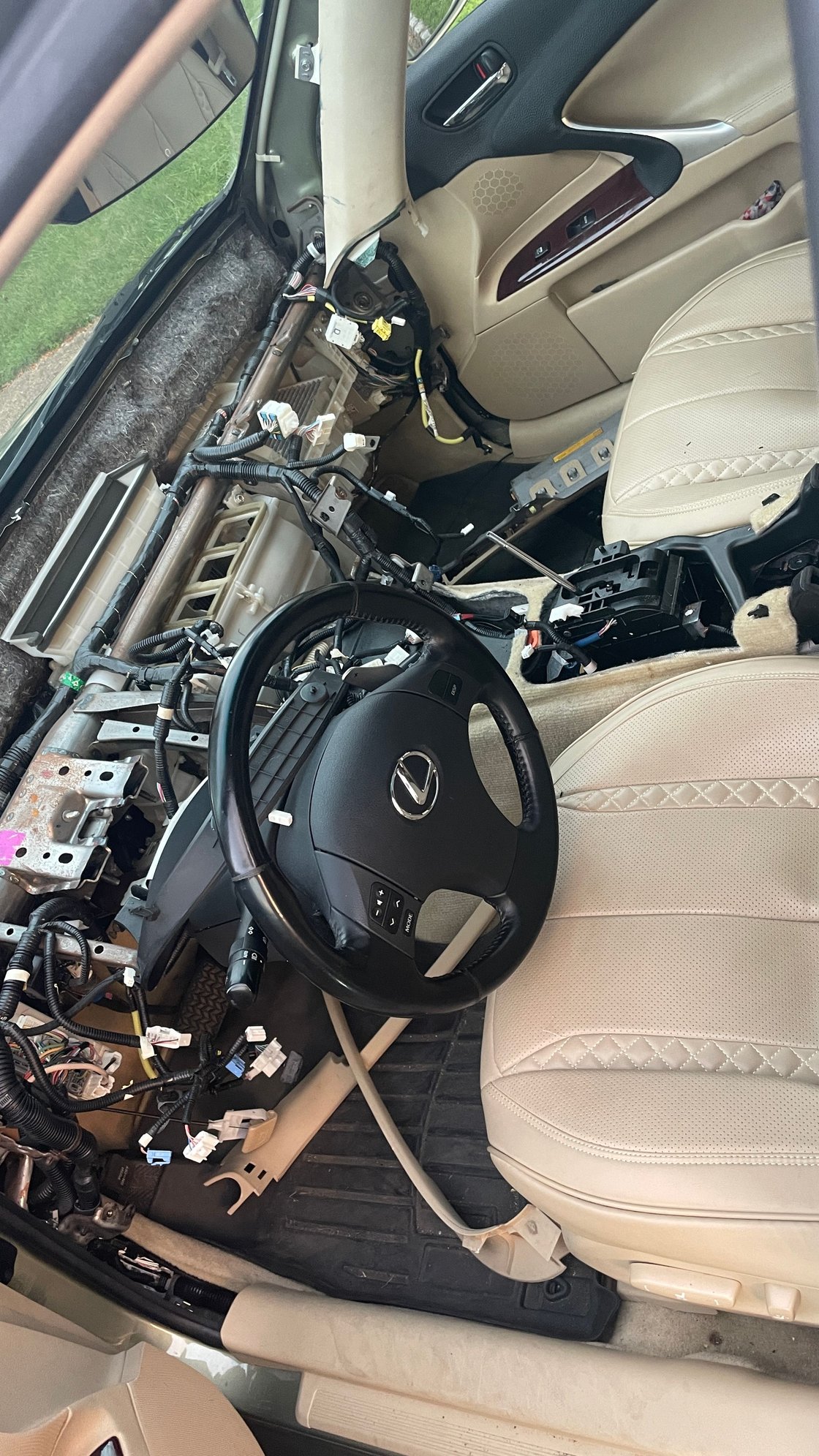 I recommend removing the dash and putting it back after you wrapped the top and around the back edge. It would be easier to continue working when it sitting fixed inside. Here is the good guide on dash removal. Skipp the steering wheel part. All you need to do is to remove two screws holding it up. No need to take steering wheel apart.