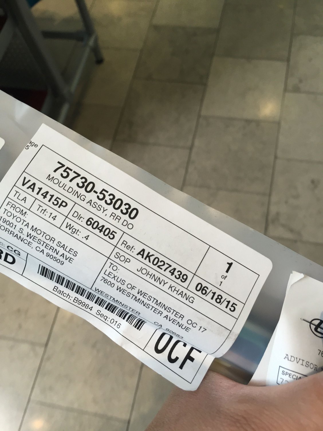 Just wanted to say thanks again to cp2 for the part number. Thanks to "Kenny" from Wesminster Lexus for rush ordering me the part that came in same day within a few hours, on top of that gave me a discount. Much appreciated Kenny. Can't wait to get home and install, the dent has been an eyesore for me. Back to normal!!!!