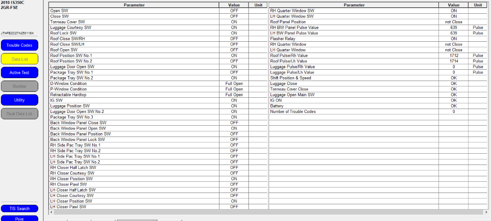 For the "pulse" sections of both the Roof and Luggage pieces (4 motors and data points), I would assume those are the corresponding motors where one raises the trunk up to free the space for the top opening/closing, and the other "roof" one is for the motor pushing the panels up into position for opening and closing the roof itself. By "pulse" I am figuring Toyota/Lexus is interpreting that as motor effort for the two sequences I am describing. Meaning, the computer is expecting certain "efforts" for the motors raising and lowering the trunk and also pushing the top up. I wonder if those are out of whack, or not expected, what happens? My guess is a failed sequence and a coded error stored. Based on comparing left and right side numbers of those 4 parameters - I would imagine if they are not conforming left-to-right that the top motors stop as a sort of safety mechanism to make sure that the top is not closed or opened out of alignment between the two sides. If it continued to operate, you would end up with sheering force between the left and right side and possibly bending the top itself. Those motors seem crazy strong, given they have to lift and retract metal parts and glass to make the top work correctly. Making sure there are checks/balances between the left and right side would be critical in insuring that the top cannot be opened or lowered when either side is not close enough to the other one in terms of sequence.