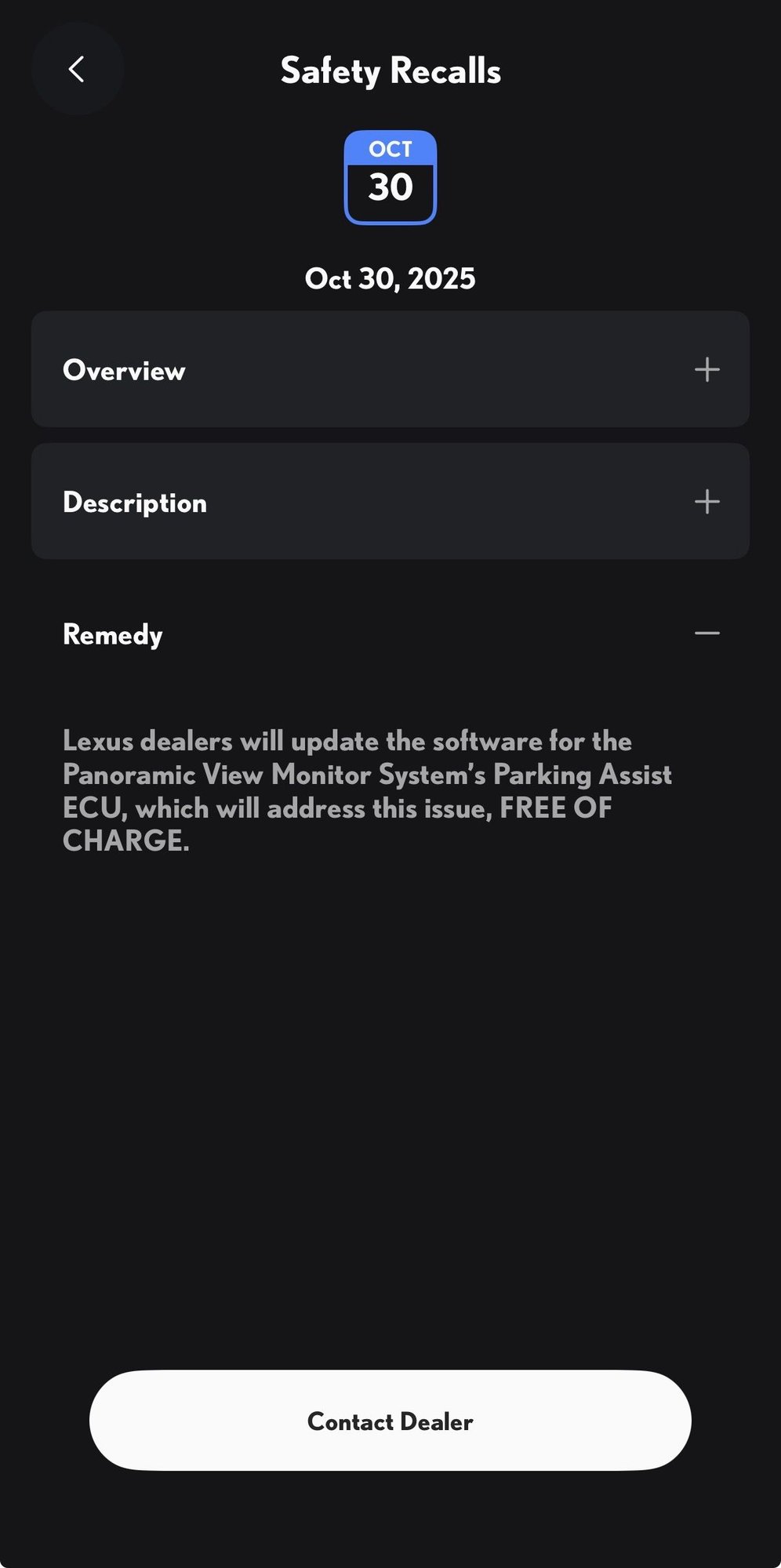 That's odd. I got the same notice for my 2018 Shelby GT350R, also with no solution yet available. Must be some component in common. This says Lexus will update the ECU. The Ford notice is almost identical, but the resolution is not specific. I can't imagine the cars use the same ECU. Maybe the camera firmware is from a common vendor?