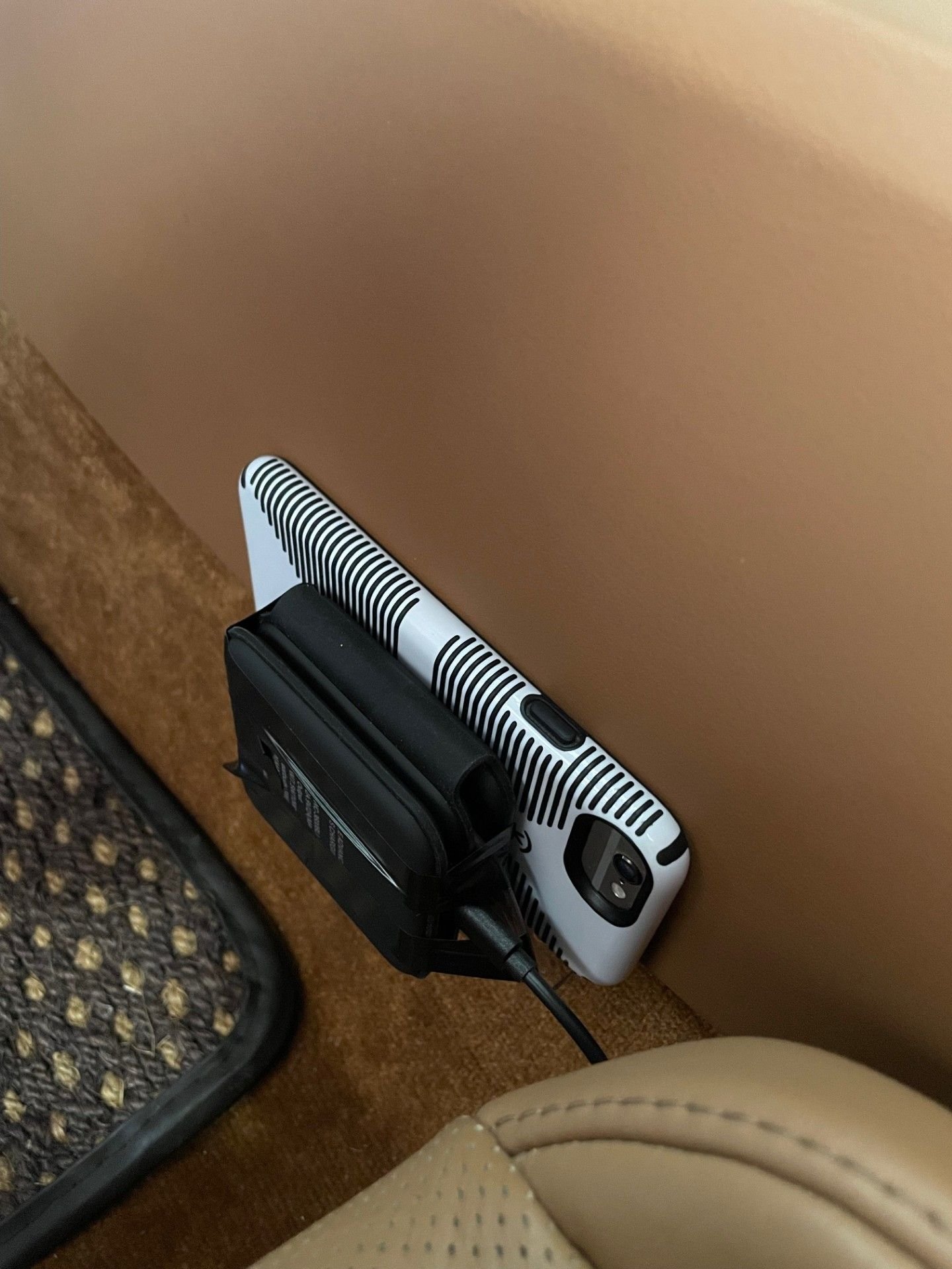 I have been looking for a pre-made device that could easily hold and charge my phone without having to plug it in to charge and hold the phone at the same time. I've come up with something that I think has some merit and it only cost me $1.25. I had a multi charging pad that can do up to 3 devices at once but only need to charge 1 phone. I wanted to make something that requires no drilling or altering of the vehicle of course. The end result is a "sponge holder" that I got from the dollar store. It comes with 2 suction cups that I will only use for friction purposes. The pictures attached give you the jest of it. I know it could be done much neater but I wanted to check the function first. End result is it works great. The phone slips right into the holder and charges without any further help. The phone stays in position and super easy to slide in and out. The charge cord goes to one of the outlets in the arm rest area.
