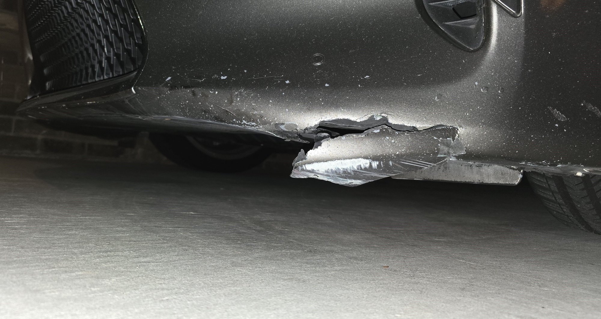 ouch, was asking cause I hit debris too and it cracked the under bumper almost exactly where urs is but its not a tear but a crack that is hard to see unless U get on ur knees. I used a jack and some angled pieces of 2x4 to force it together after using JB Weld"plastic bond", let it set 72 hours and its holding so far. Put some touch up paint on crack and lightly buffed it with polisher. No one will see it unless they are under car:}