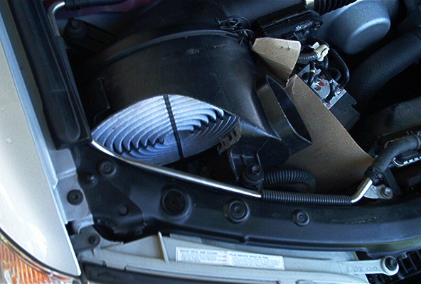 Now, the mod that I did on my LS400 creates as much flow and KEEPS the stock air feed over the radiator. This feed is cold air and also seals off some of the engine compartment heat. YOU MUST fabricate a cold air box. Look closely at my mod and you will see I am actually using cardboard to block off engine heat/air flow. I am drawing cold air from around the headlight area and the stock cold air feed over the radiator. The modified front cover helps form both part of a cold air box AND supports the factory cold air feed.