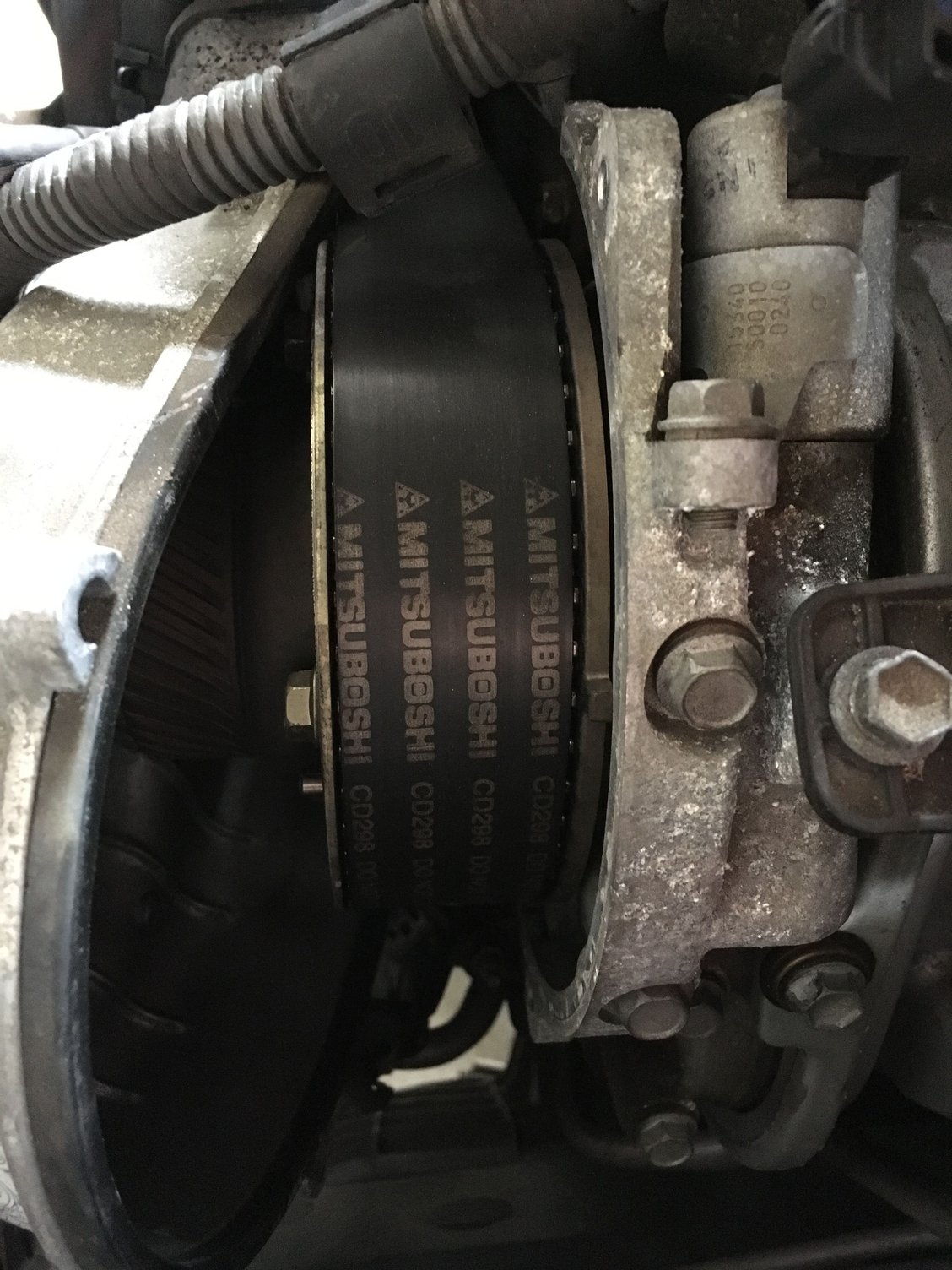 Took the left timing cover off to check out the belt and I will post the pic below. Not sure if Mitsuboshi were oem from factory or not. Does anyone know? TB was apparently done at 115k. Now at 144k. Is that about normal wear for a TB at 30k?