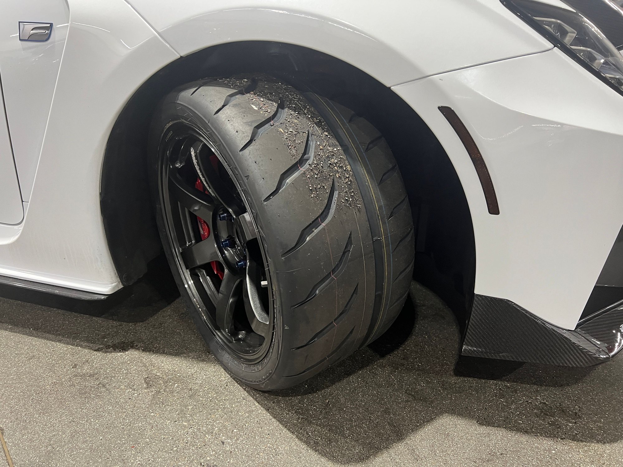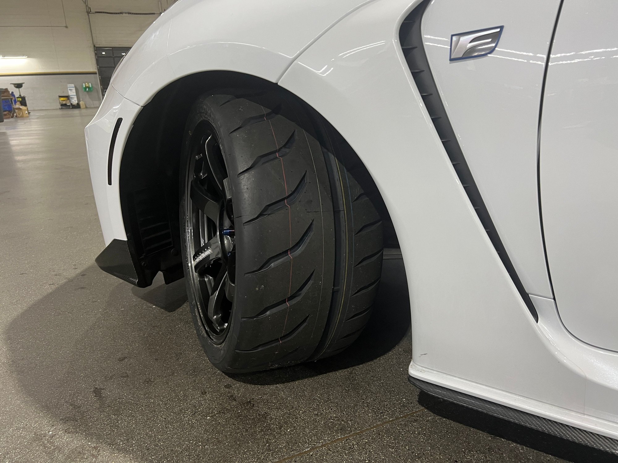 This is what room in the wheel wheel looks like with 295/30R18 in the front. At full steering angle. Slight rubbing on the inner liner but I will never have that kind of angle.
