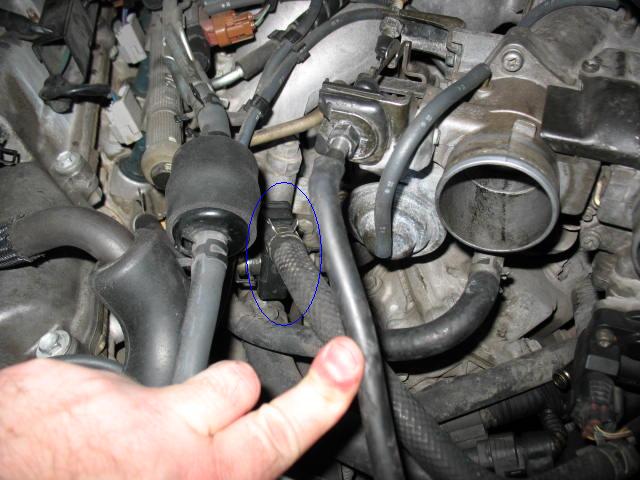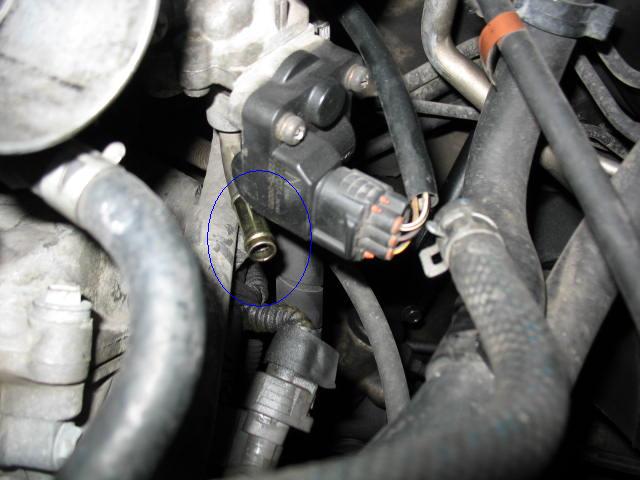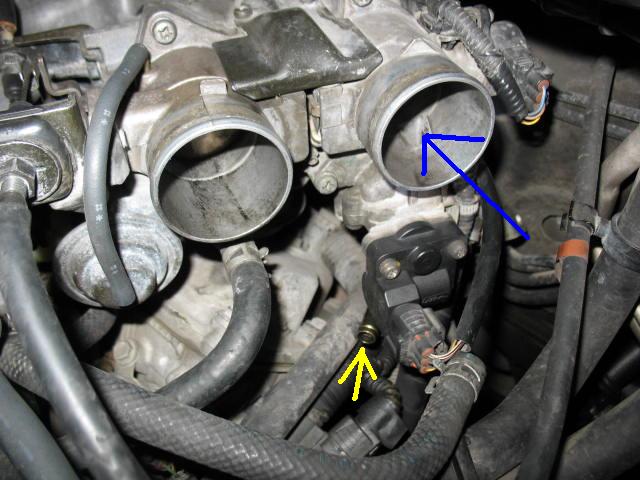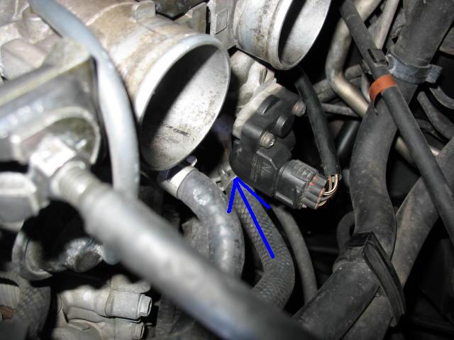 Note below the blue arrow. This is running along top the air assist hose that connects to the engine block through some hoses and goes into the IACV valve at the end of the arrow.