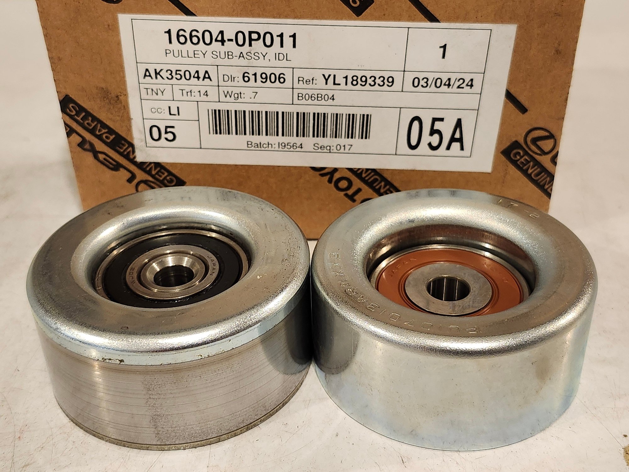 Working on a 2014 RX350 with a noisy belt tensioner pulley. I shopped very carefully for the pulley, and all my research indicated that I needed 16604-0P011, which supersedes 16604-31020. Pulley came in, pulled the old one, and they do not match. The tensioner pulley has a 24mm bearing, and the new pulley has a 13mm bearing; apparently it's an idler pulley. Does anyone know the correct part number for the tensioner pulley? I can get a Chinese pulley with the right dimensions from Amazon for $20, but I would really rather get OEM quality. Thanks!