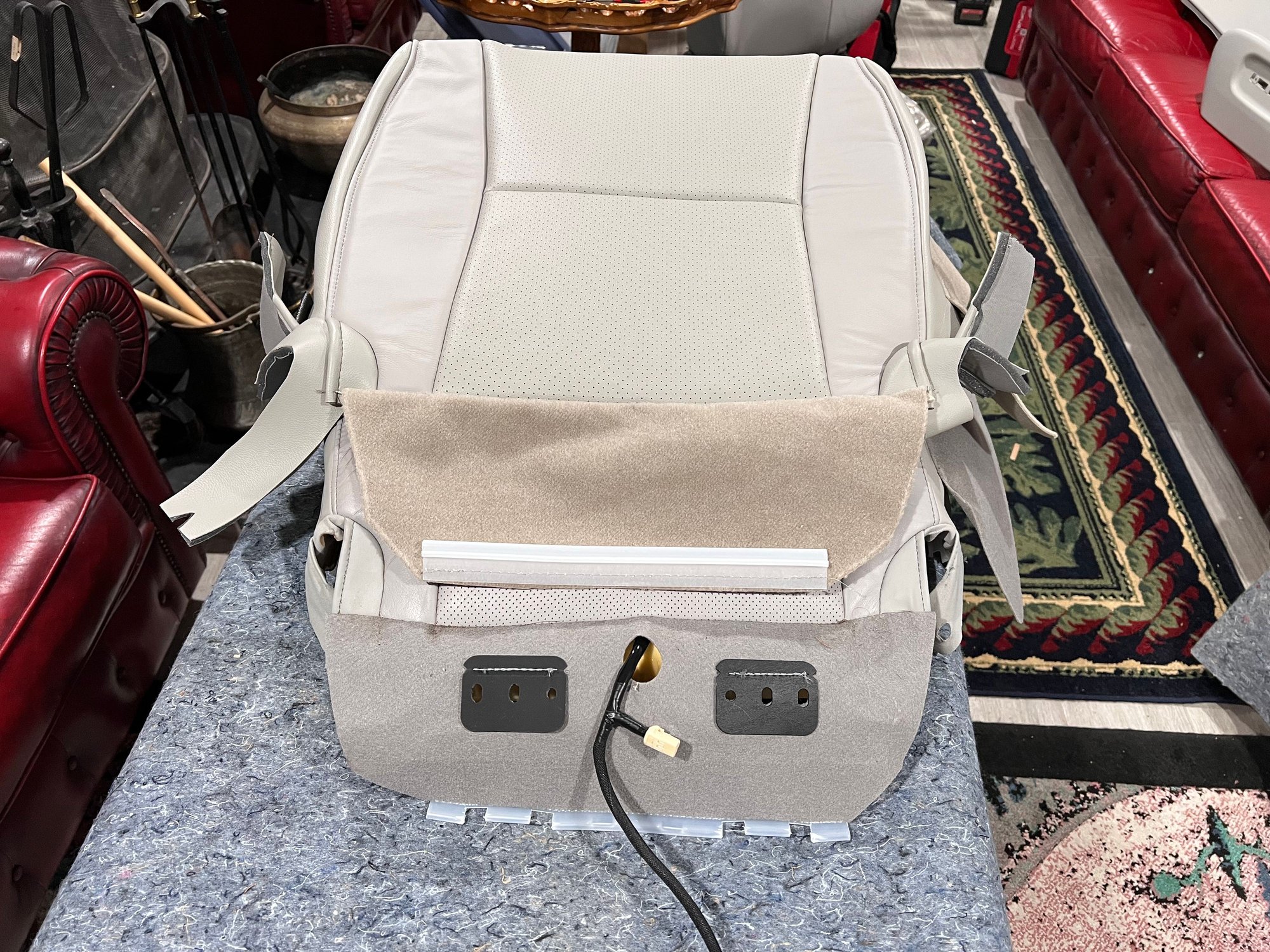 A few observations on quality of the eBay kit. The leather texture is rougher, the perforated middle section has wider spaced holes and is a shade closer to beige than gray. The carpeted section that covers the right and back sides is beige instead of gray. The inner structure that attaches to the hog rings is much cheaper looking than what Lexus designed. For example, the strips that attach to the foam cushion are made out of cardboard instead of wire! You also have to transfer the heating pad which comes included with the Lexus leather. In addition, I had to transfer the back wire holsters that were sown into the original part - annoying to do. However there is a large price difference, $160 for eBay vs $700 for Lexus.