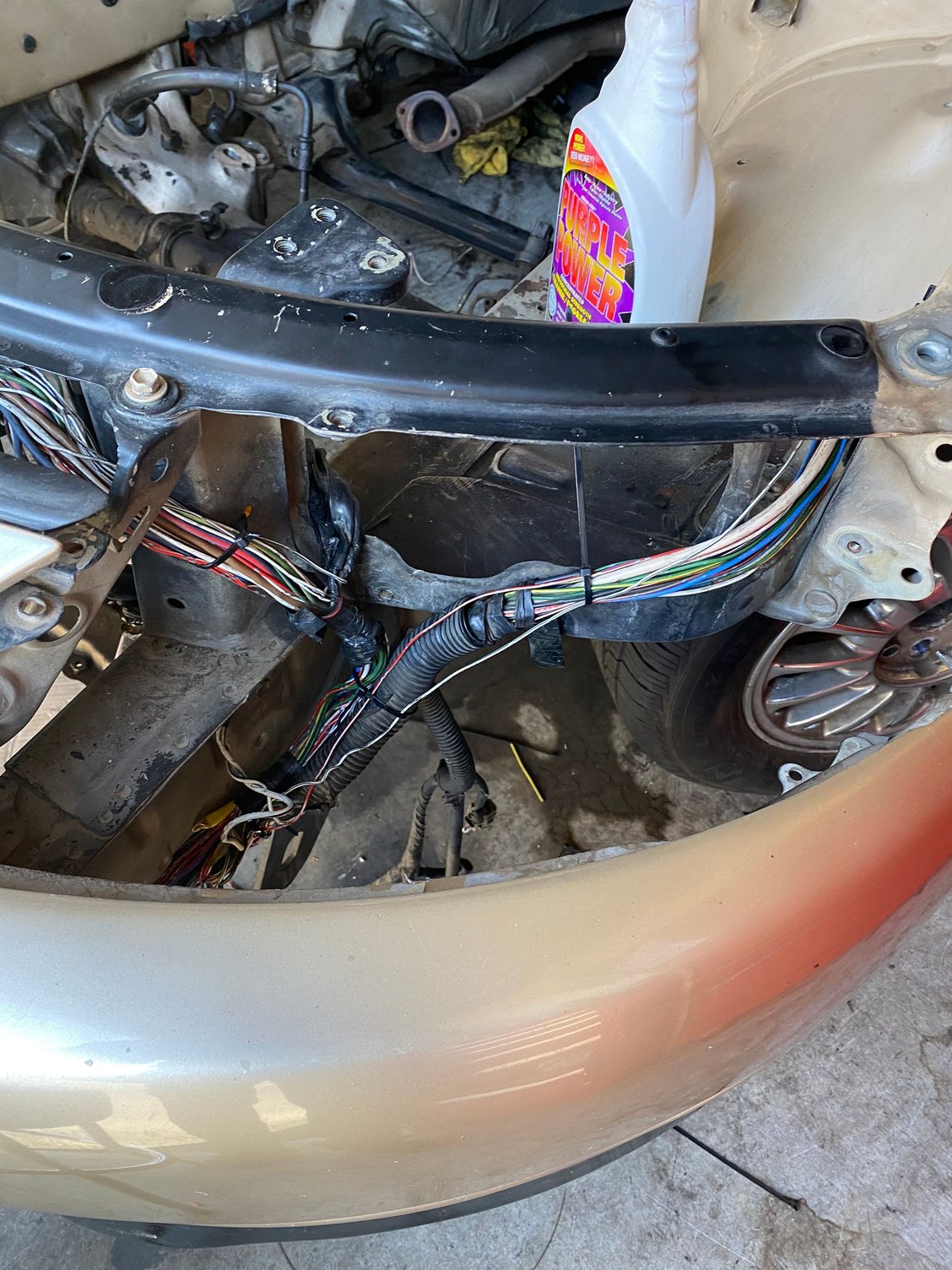 I routed everything for the wire harness on the driver side about how I wanted it I will be making small reliefs in the fender apron to run the wires up and above without worry of a sharp edge tearing into the harness over time. I stripped the ABS and Trac relay box out of the harness I don’t see this causing issues but I sure hope not I have seen abs deletes cause some issues in some cars but anyway I went to my local yard and found a torn up sc and shipped the section of harness in the wheel well so I can extend all the wires and still match factory colors and wire sizes