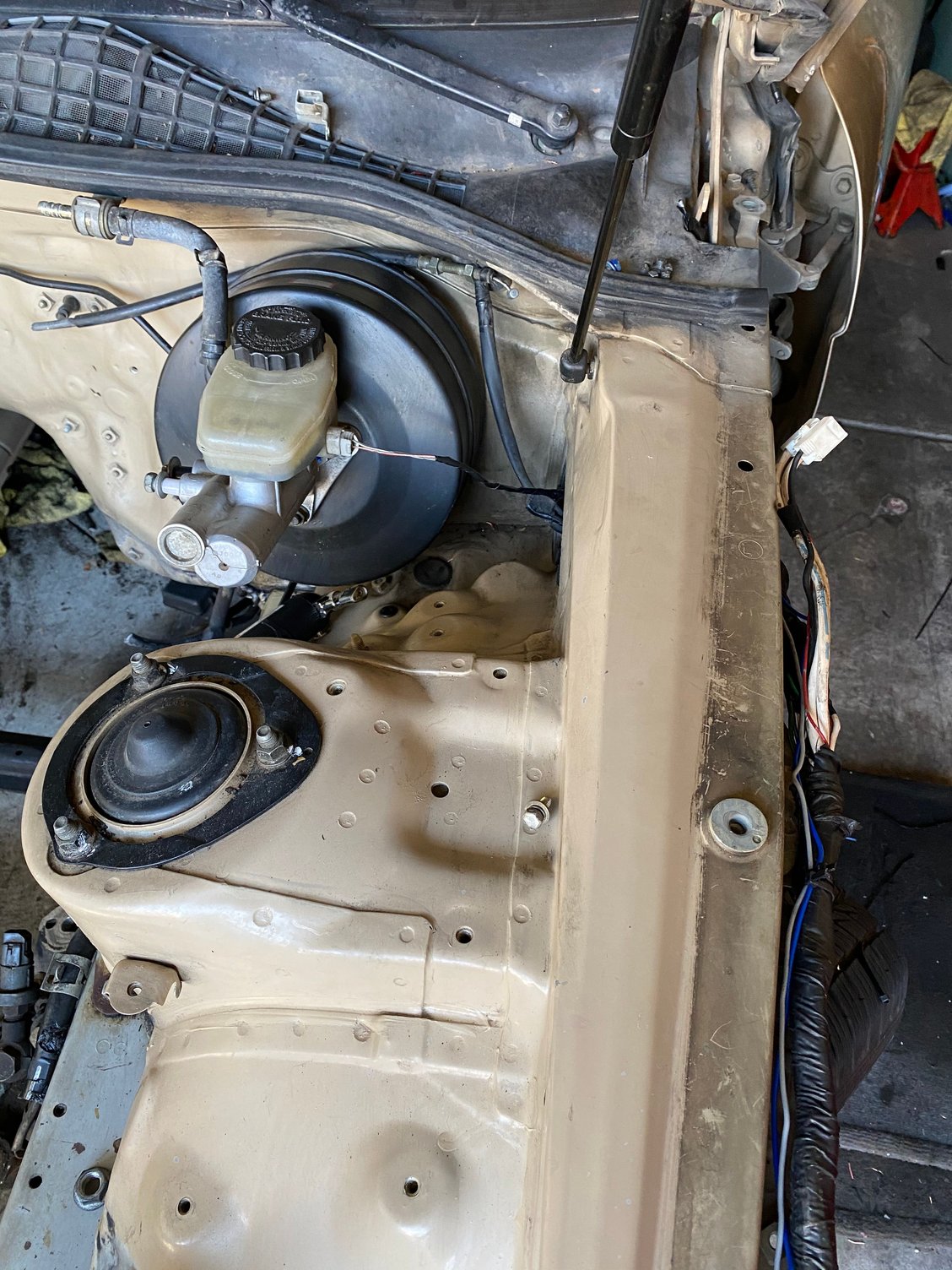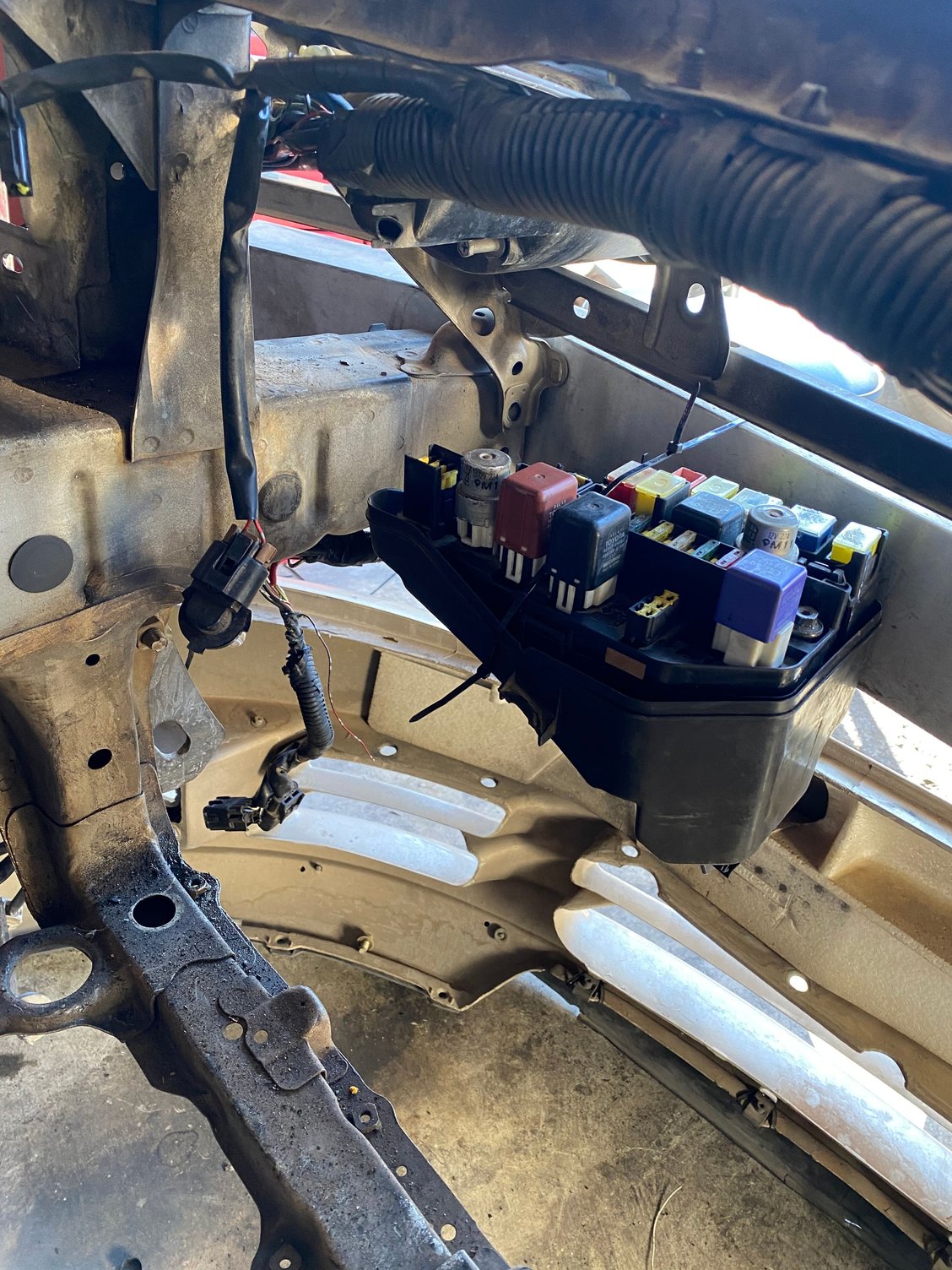 after I do the abs delete I plan on stripping the factory harness to the fuse box and running it on top of the fender apron and I’m thinking of relocating the fuse box itself the area behind the high beams keep the clean look with minimal wiring extension still looking into the passenger side harness
