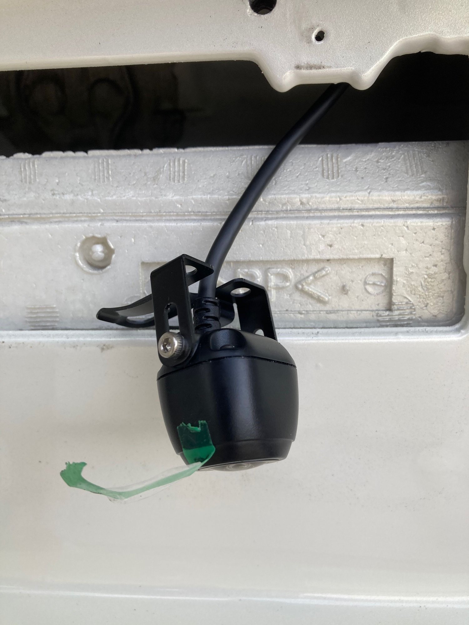 Camera mounted on plate showing U cut to hide and allow cable to turn without stress behind plate, then through to trunk.