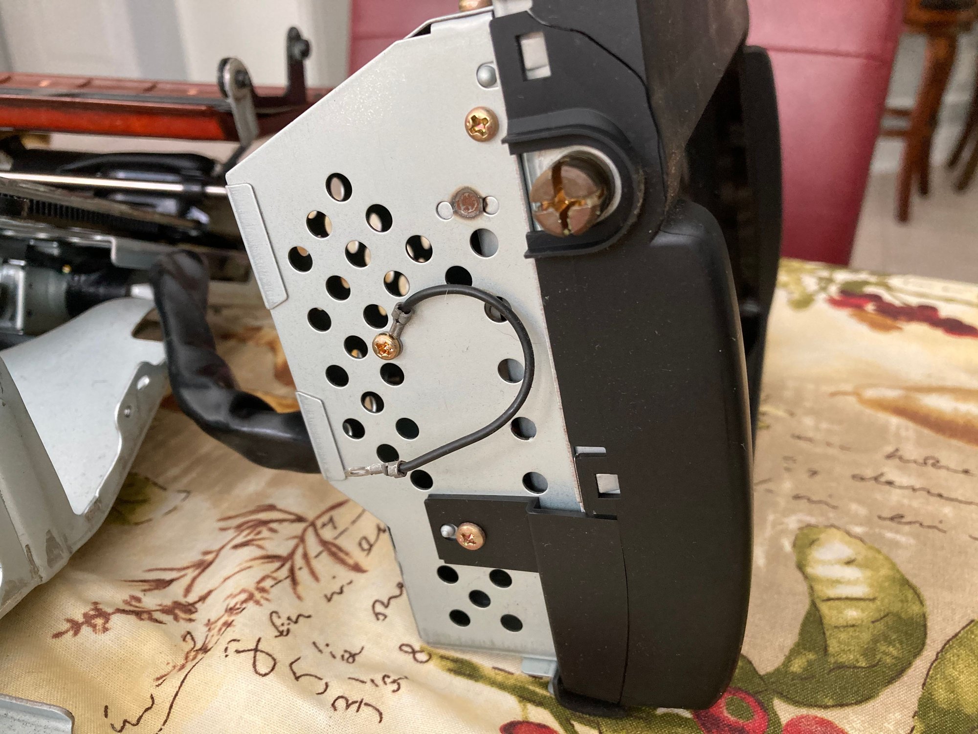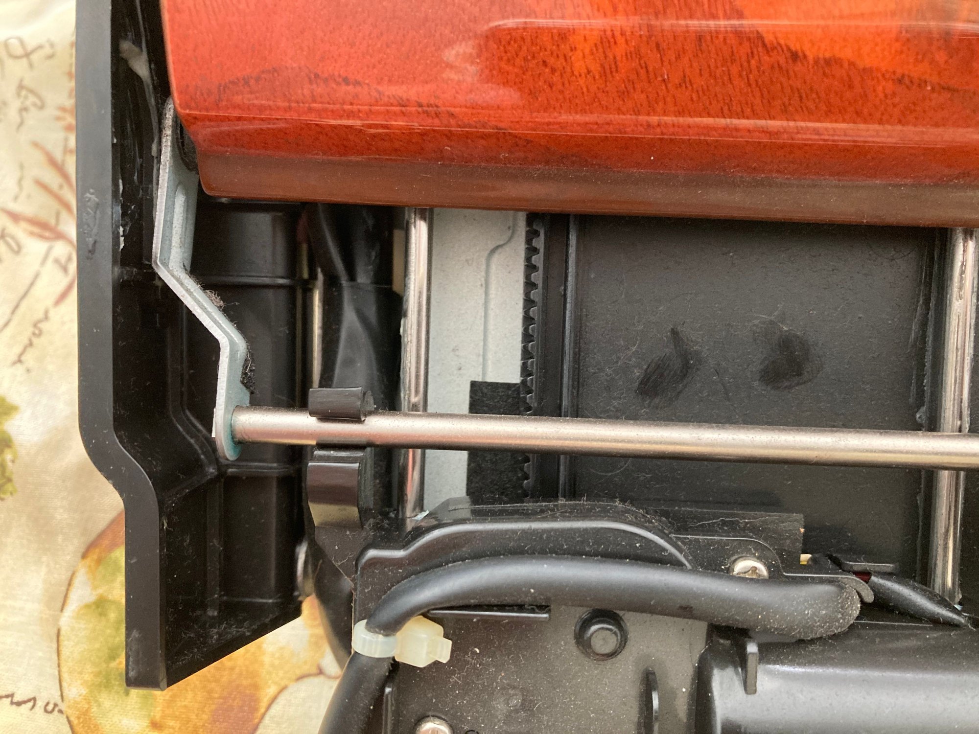 The Garmin 61 fits nicely into the bezel. I secured it using foam strip around the edge of the bezel which when stuck in was about 1/8 proud of the lip. I then positioned the Garmin on the foam and cut down with a razor blade around the edge. I was then able the remove the foam to the same edge as the bezel so making a snug lipped aperture for the Garmin to sit in. Depending on Garmin unit being installed remove the foam so as not to obscure the microphone. I also drilled a 1/16 hole in the front forward edge of the bezel where the Garmin microphone is located in the top left edge of the Garmin. Re attach the now clean screen sub chassis to the bezel. To hold the Garmin in the aperture I padded out from the back of the Garmin up to the screen sub chassis screw tabs with stiff foam, and to keep the foam in place inserted the screws that previously held the screen and electronics in the chassis. Attach the sub chassis to the main chassis. To get power to the unit I used an extension Mini USB to Mini USB cable as the Garmin cable used with the back up camera is not long enough to enable the wireless receiver in the cable to clear the unit when it is inserted back in the dash. By using an extension it also makes positioning the wireless receiver and the power connection from the car so much easier. I brought the power out of the back of the screen chassis by snipping out a small section of the chassis with wire cutters and using a grommet to make the cable safe. I also zip tied the cable to the chassis so movement did not pull the usb connector out of the unit when putting everything back together. I silicone greased the tracks and pivots and rack gear of the unit before assembling the head unit. I also checked every screw and fixing on the unit while I had it apart. After 17 years a number needed tightening.