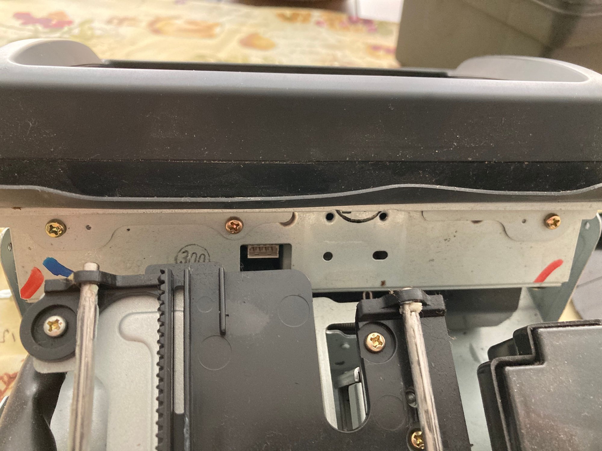 Bezel shroud piece and flex strip(shown) need to be removed. Tilt anchor plate is removed in this pic. This allows screen chassis to be lifted up while still attached by cabling to electrionics which are retained and do not need to be disconnected from cabling.