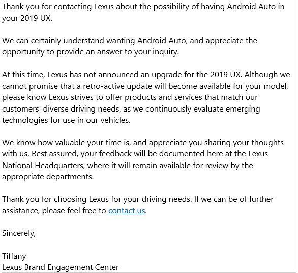 Anyone know is Lexus is still planning on adding Android Auto update to the 19 UX? I have a 19 UX250H and heard it was suppose to come close the the end of 2020?