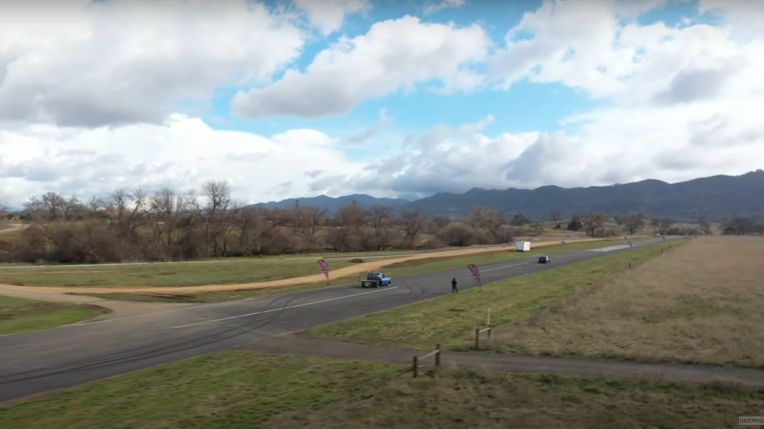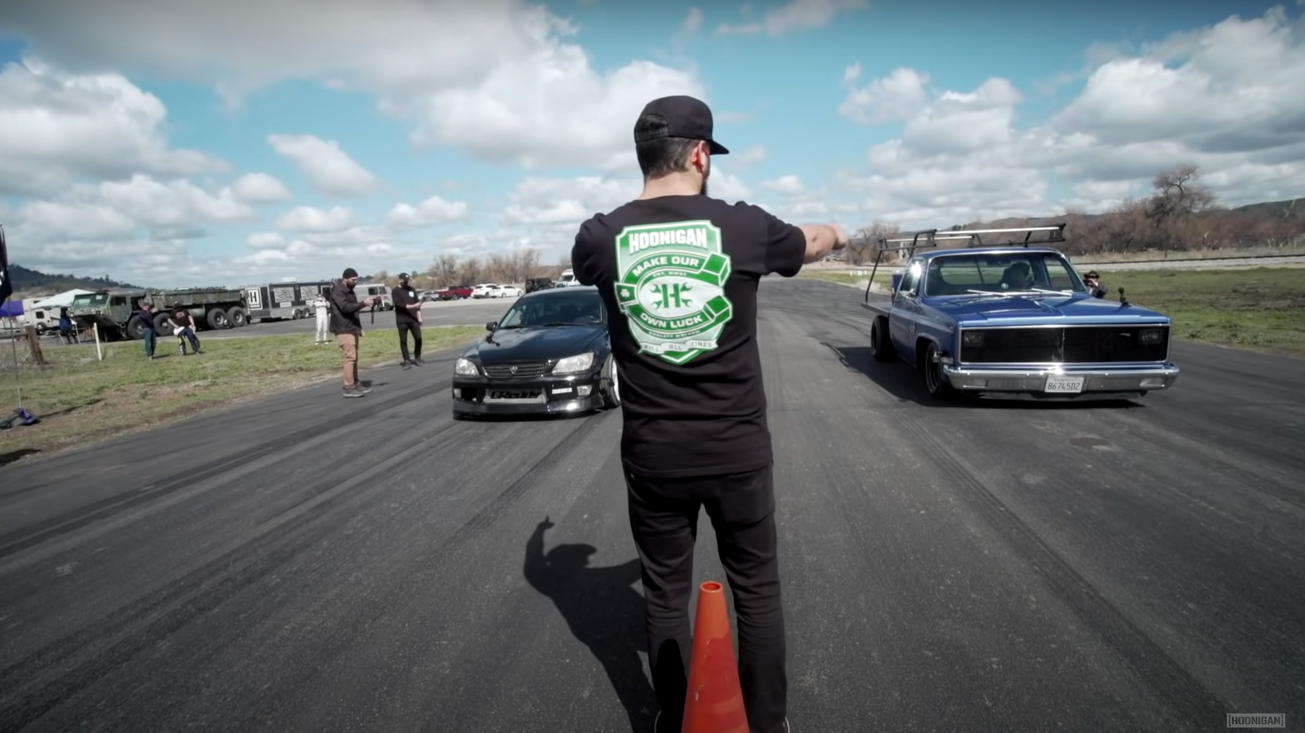 And of course, that's precisely what Hoonigan does here. In the first race, the Lexus leaps off the line and establishes an early lead over the C10, which appears to be sluggish after that. After the IS takes the win, the Chevy driver explains that he's having some issues with his truck's timing, but he didn't bother to bring along a timing light to diagnose them.